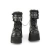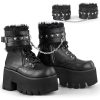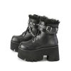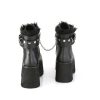 Unleash your inner rebel with Ashes-57 ankle boots. Crafted with attention to detail, these boots feature a 3.5″ chunky heel and a 2.25″ cut-out platform to give you a commanding presence. The heart eyelet lace-up design adds a playful touch, while the fur-lined adjustable removable ankle cuffs with heart studs bring a daring edge. Complete with D-ring and chain with swivel snap hooks, these boots demand attention with every step. Made from black vegan leather, they not only look great but also align with your compassionate values.