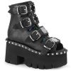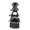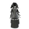 Introducing the Ashes-70: where futuristic style meets punk rock attitude. This bootie sandal stands tall on a 3.5″ heel and a 2.25″ platform, outlined with daring metal studs for an unstoppable look. Constructed from the finest black vegan leather with hologram details that catch the light – and gazes – from every angle. The ensemble of four buckle straps, enhanced with striking silver chrome metal plates, offers an unparalleled aesthetic. A convenient back zip closure completes this avant-garde piece, ready to add a touch of rebellion to your ensemble.