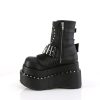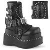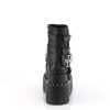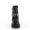 Elevate your attitude with the Bear-150; an ankle boot that redefines boldness. Featuring a ferocious 4 1/2″ tiered pyramid-studded platform and robust black vegan leather, each step resonates with confidence. The intricate lace-up design, accented with a quilted and studded shield, metal bars, and an O-ring center strap, embraces your alternative spirit. Plus, a convenient side zip closure harmonizes with a spike stud and skull patch that command attention. Stomp out the mundane and showcase your style with Bear-150!