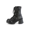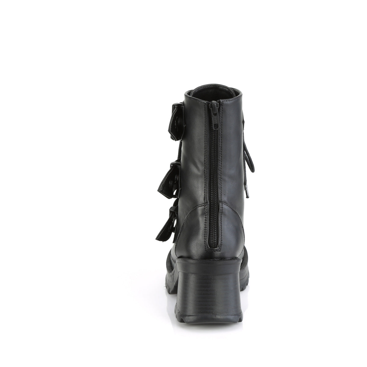 Step into the spotlight with the Bratty-118 boots—a fierce addition to any wardrobe. These ankle boots feature a robust 2 3/4″ heel paired with a 1″ platform for an empowering lift. Black vegan leather envelops your feet, leading up to an eye-catching triple buckle with eyeleted straps for an industrial-chic vibe. The metal back zip closure offers ease and efficiency, making them a practical choice for those with a busy, on-the-go lifestyle. With the Bratty-118, you can stamp out conformity and strut with a sustainable edge.