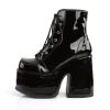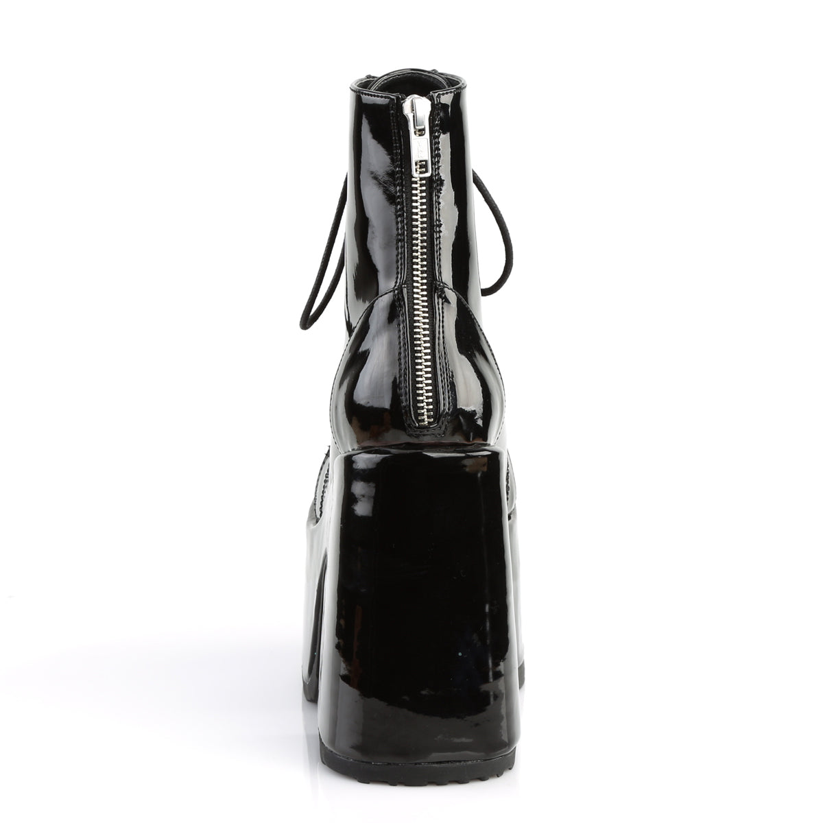 Step up your fashion game with the fierce and edgy Camel-203 ankle boots. These stunning boots feature a chunky 5″ heel and a 3″ platform, allowing you to stand out in any crowd. The sleek black patent leather provides a unique and captivating look, that is sure to turn heads wherever you go. Whether you’re getting ready for a night out or want to make an effortless statement in your everyday ensemble, these boots are sure to elevate any outfit. The metal back zip closure ensures easy on and off, perfect for those who are always on the go. Add the Camel-203 to your shoedrobe today and step out in style.