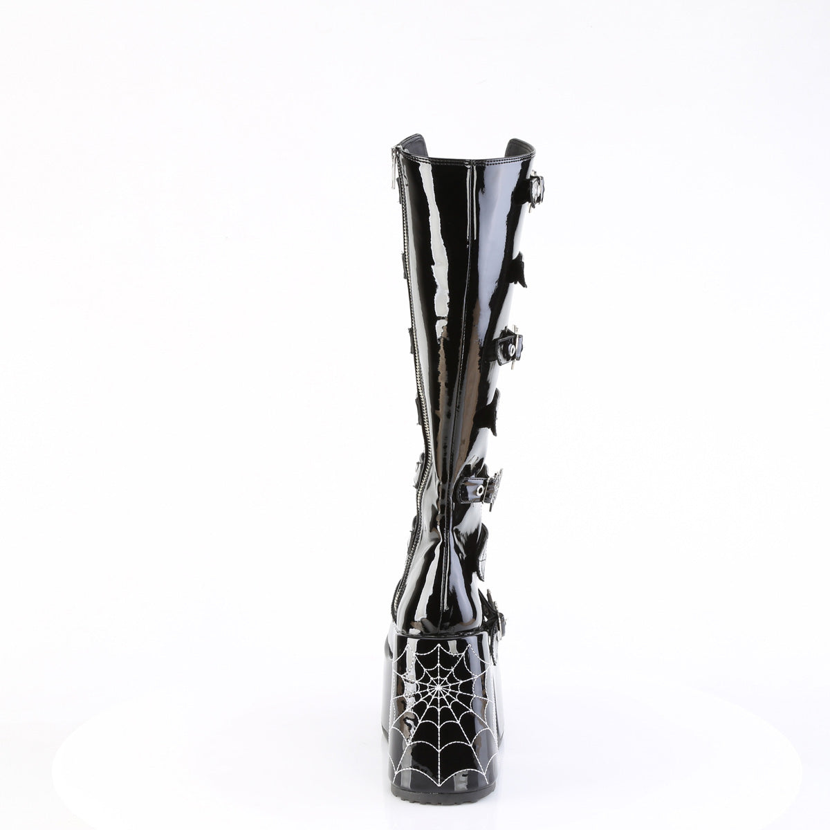 The Camel-223 knee-high boots are here to shake up your shoe game. With a 5″ block heel and 3″ platform, they give you a confident lift while keeping things wearable. The open-front design keeps them breathable, and the mix of heart and spider web buckle straps adds a playful-yet-mysterious vibe. A hook-and-loop closure and the embroidered spider web on the back is the perfect finishing touch. Dressed in high-shine black patent, these boots are ready to take on nights out, concerts, or just your everyday adventures.