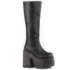 Elevate your style with the fearless Camel-280 knee-high boot. This gothic-inspired boot features a commanding 5″ block heel and a 3″ faux wood wrapped platform, combining edge and elegance effortlessly. The rich black vegan leather adds a touch of sophistication to any outfit, while the inner side zip closure ensures easy on and off. From concerts to cosplay events, these knee-high boots are designed to turn heads. Make a bold fashion statement with Camel-280 and embrace your unique style.