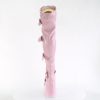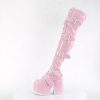 Step into a dreamy realm with the Camel-305, a boot that dazzles in a mesmerizing baby pink stretch hologram finish. Standing tall on a 5″ chunky heel paired with a supportive 3″ platform, these lace-up stretch thigh-high boots redefine bold and beautiful. Detailed with captivating buckle straps that wrap around your legs, the Camel-305 offers a seamless fit through a full-length inside metal zipper, making it the ultimate statement piece for those who dare to stand out in style.