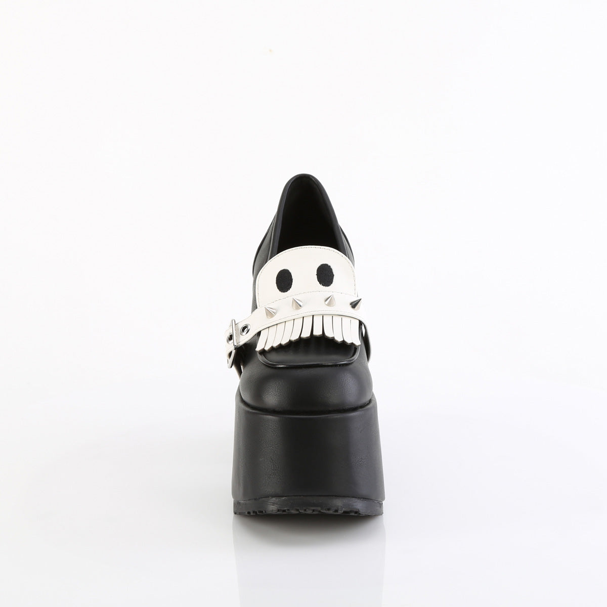 The Camel-58 redefines the Oxford shoe, blending classic style with rebellious punk influences. It features a robust 5″ chunky heel and a significant 3″ platform, all wrapped in premium black vegan leather that mirrors the look and feels of the real thing without the impact. The shoe’s true highlight is the dazzling silver chrome spike cone studs that embellish the strap, providing a sharp contrast to its dark backdrop. For a daring fusion of goth and glam, the Camel-58 is the ultimate choice for fashion-forward individuals.