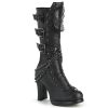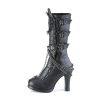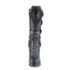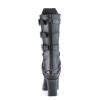 Step into the shadowy elegance of the Crypto-67, a boot that commands attention with its distinctive styling. The 4″ block heel and 3/4″ platform set the stage for a boot that melds comfort with an aggressive posture. Accents such as coffin buckle straps and a skull patch underscore its gothic inspirations. The lace-embellished quilted front panel, detailed with studs and an eye-catching swivel hook cascading chain, creates a focal point that’s both intricate and captivating. Finished in black vegan leather and equipped with a convenient metal back zip closure, the Crypto-67 boot is for those who embrace the edge.
