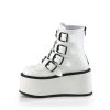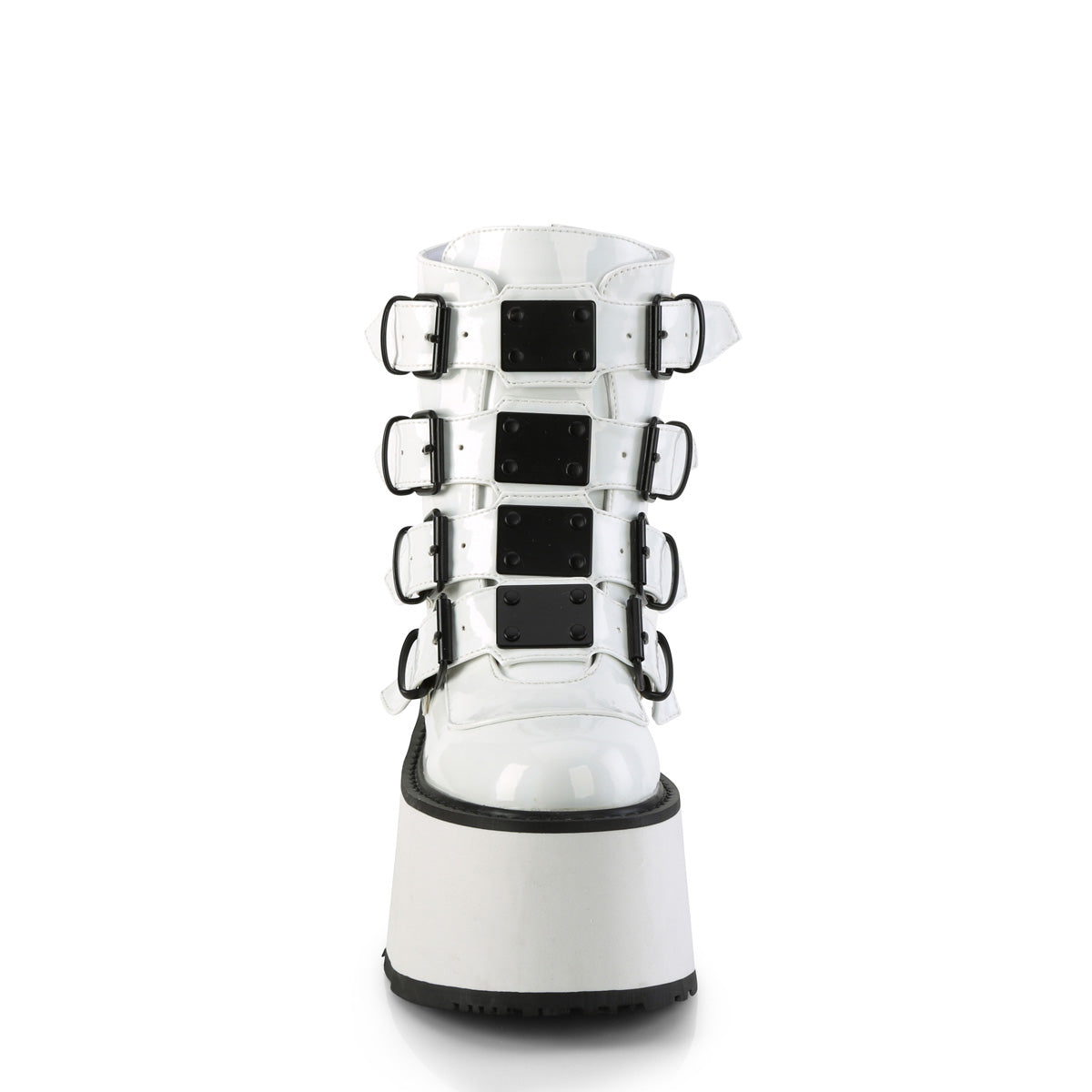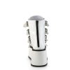 Discover the edgy allure of the Damned-105 ankle boot. This piece is a true showstopper, featuring a 3 1/2″ platform for an elevated look. The boot is accented with quadruple buckle straps, each boasting a central metal plate, for an unmistakable punk-rock vibe. The white holo patent provides an iridescent sheen that’s sure to turn heads, while the back metal zip closure adds an extra layer of sophistication to its design. Perfect for those looking to add a statement piece to their footwear collection.
