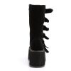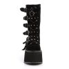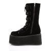 Step into the night with Damned-225, a pair of mid-calf boots that redefine edgy elegance. Crafted with plush black velvet and standing on a 3 1/2″ platform, these boots exude a dark allure. The lace-up front is both stylish and functional, leading the eye to six cone-studded buckle straps that wrap around your calves like a manifesto of alternative fashion. Complete with a handy inside metal zip closure, the Damned-225 boots are the epitome of gothic glamour, ready to elevate your ensemble and make a statement wherever you tread.