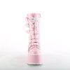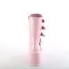 Transform your outfit into a statement with the Damned-225 boots. Sitting on a bold 3 1/2″ platform, these mid-calf boots feature an intricate lace-up front and are adorned with six cone-studded buckle straps for a dash of daring. The eye-catching baby pink holo patent material captures the light in mesmerizing ways, complemented by the convenience of an inside metal zip closure. Perfect for those looking to add a splash of vibrant edginess to their ensemble.
