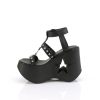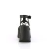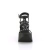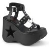 Turn heads with the Dynamite-12 sandal, where daring design meets sophisticated style. The 5″ platform wedge, detailed with star cutouts, elevates your look, literally and figuratively. Wrapped in black vegan leather, this sandal features a wrap-around ankle strap, complemented by the aesthetic of strappy exuberance. Silver-tone star studs and a distinctive star ring detail add a gleam of rebellious charm. Whether for special occasions or a night out, the Dynamite-12 embodies the spirit of those who stand out from the crowd.