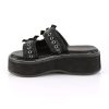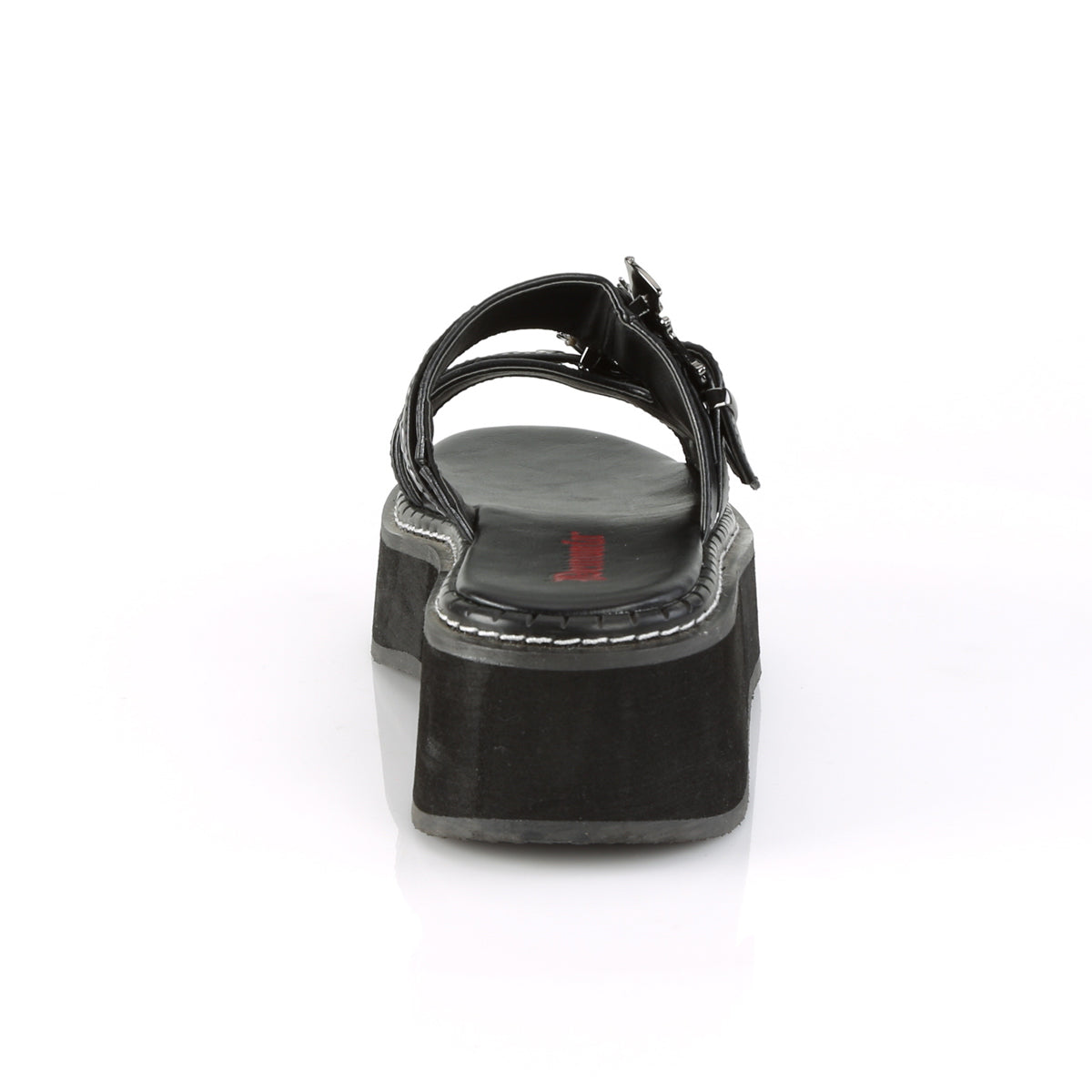 Meet Emily-100, the perfect choice for any fashion-forward style lover looking for a chic and edgy summer sandal. These black vegan leather slide sandals boast a bold 2″ platform, making them ideal for adding a little extra height and attitude to your look. The double strap design is adorned with eye-catching rivets, adding a touch of edginess to these already striking sandals. The ornamental bat buckles add a touch of gothic charm to these sleek and sophisticated sandals. Whether you’re headed to a festival, night out with friends, or just looking for a stylish and comfortable accessory for everyday wear, Emily-100 is the perfect choice. With a comfortable yet secure fit, you won’t want to take these sandals off.