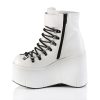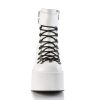 Elevate your shoe game with the striking design of the Kera-21. This ankle boot is a true statement piece, boasting a 4 1/2″ platform and detailed with an eye-catching front lacing. Fashioned from white vegan leather, it shows off your style while being conscientious. The adjustable dual buckle ankle cuff adds an extra touch of edge and a tailored fit, while the side zip closure offers ease of access. The Kera-21 is a bold choice for those who dare to stand out.