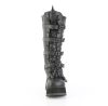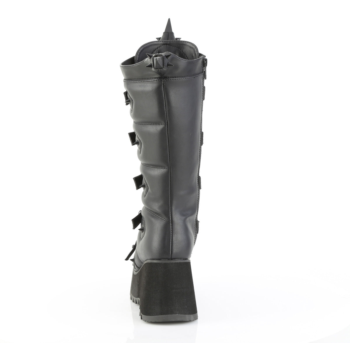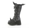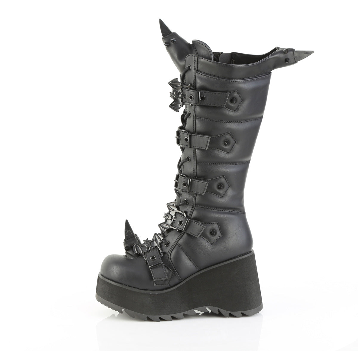 3 1/2″ (89mm) Platform Lace-Up Knee High Boot Featuring Eyeleted Centered Bat Buckle Straps & Rubber Spiked Rhino Horn Detail on the Toe, Upper Back & Tongue, Full Length Inner Side Metal Zip Closure