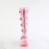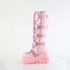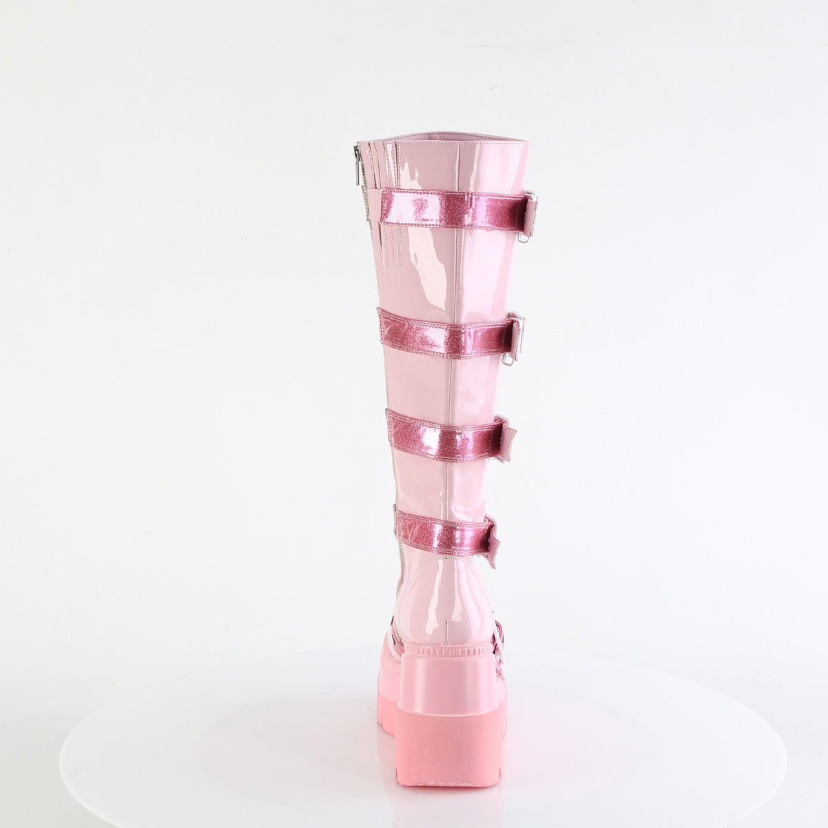 The Shaker-210 boots bring together the best of both worlds: daring heights and darling details. Standing tall on a 4 1/2″ wedge platform, this knee-high boot is enveloped in a luxurious baby pink patent finish. The distinctive buckled heart shield, punctuated with round studded details, creates a statement centerpiece that’s both sweet and sassy. Completed with a metal inner side zipper for seamless on and off, these boots are designed for those who love to stand out from the crowd in style.