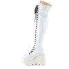 Introducing the Shaker-374 thigh-high boots: where futuristic design meets standout style. Perched on a 4 1/2″ wedge platform, these boots flaunt a striking white hologram stretch patent for an eye-catching, iridescent effect. The lace-up front allows for a tailored fit up the leg, while a full-length outside metal zipper adds a touch of industrial chic and simplifies the process of slipping them on and off. Perfect for those who love to make a statement, the Shaker-374 is an unforgettable addition to any ensemble.