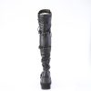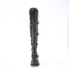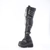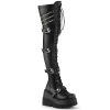Elevate your look with the Shaker-420 – an ultra-chic, wedge platform thigh-high boot with a bold attitude. The front lace-up design, quadruple skull buckle strap, and ornamental zip closure details will make an impact on any outfit. The full inner side zipper closure allows for easy on and off, while the black stretch vegan leather ensures a perfect fit. Ideal for those who like to express their edgy style, this thigh-high boot adds just the right touch of attitude to any outfit.