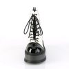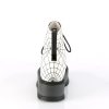 Embrace the dark allure of the Slacker-88 ankle boots, where fashion meets the shadows. This striking pair showcases an unmissable embroidered spider web detail on a 2″ platform silhouette. Crafted with white glow vegan leather set against black patent, these lace-up boots captivate at every turn. Whether you’re making an entrance at a party or accentuating your everyday alternative look, the Slacker-88 boots are a bold statement for those who dare to be different.