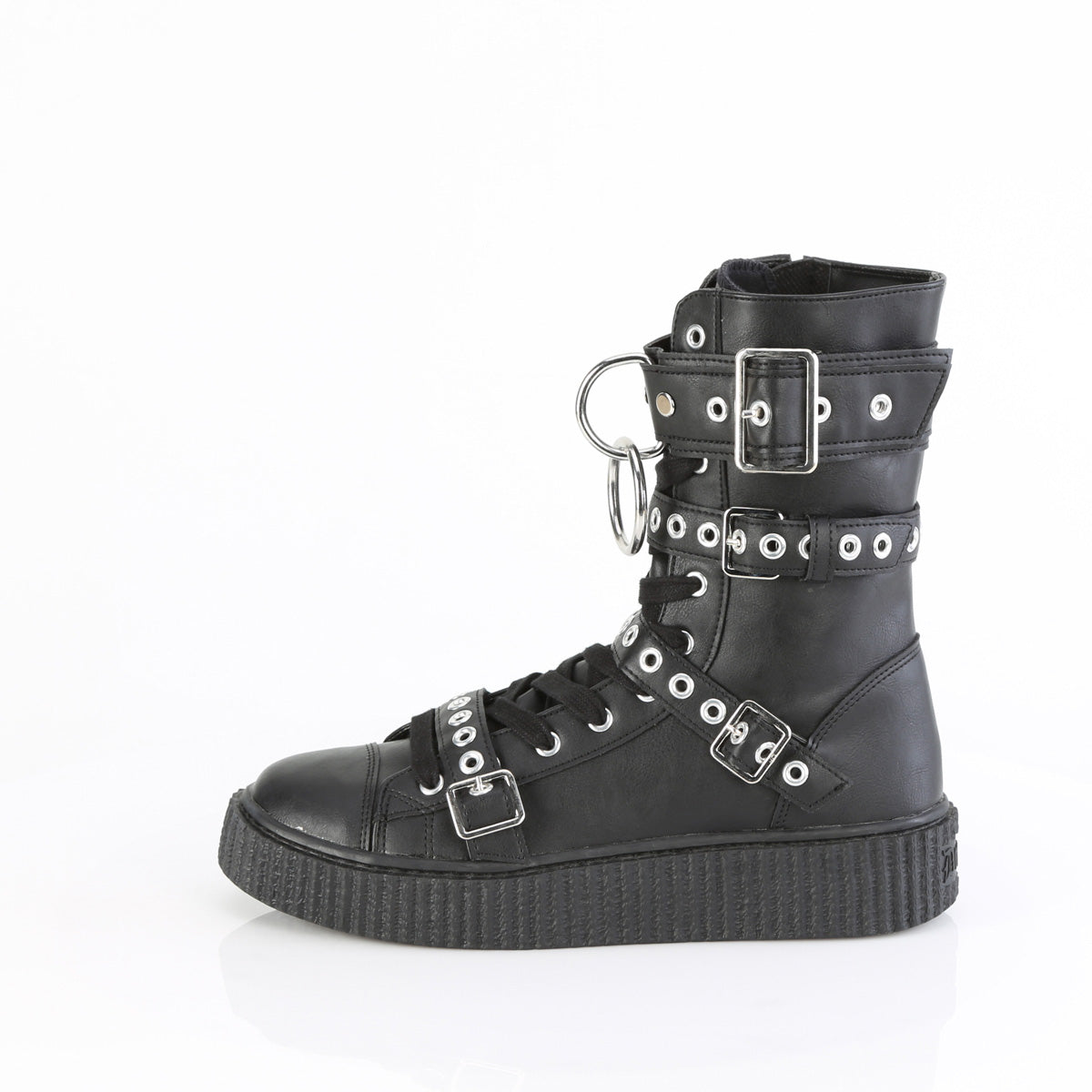 The Sneeker-320 is the kind of shoe that turns heads without trying too hard. The 1 1/2″ platform and sturdy rubber sole give it a confident lift, complete with a lace-up front and buckle straps . A hanging O-ring detail at the top adds just the right amount of edge, and the full inner side zip adds practicality. Made from smooth black vegan leather, they’re as easy to style as they are to put on—pair them with your favorite ripped denim, cargo pants, or anything that needs a little extra kick.