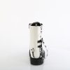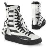 The Sneeker-325 is where streetwear meets a little something extra. A lifted rubber sole and round toe give these mid-calf sneaker-boots a sturdy, confident stance. The bold striped side panels and industrial-chic hanging chain details make sure they’re anything but basic. Dressed in sleek white vegan leather with fishnet peeking through, they’re the kind of kicks that pull an outfit together—or steal the show on their own.