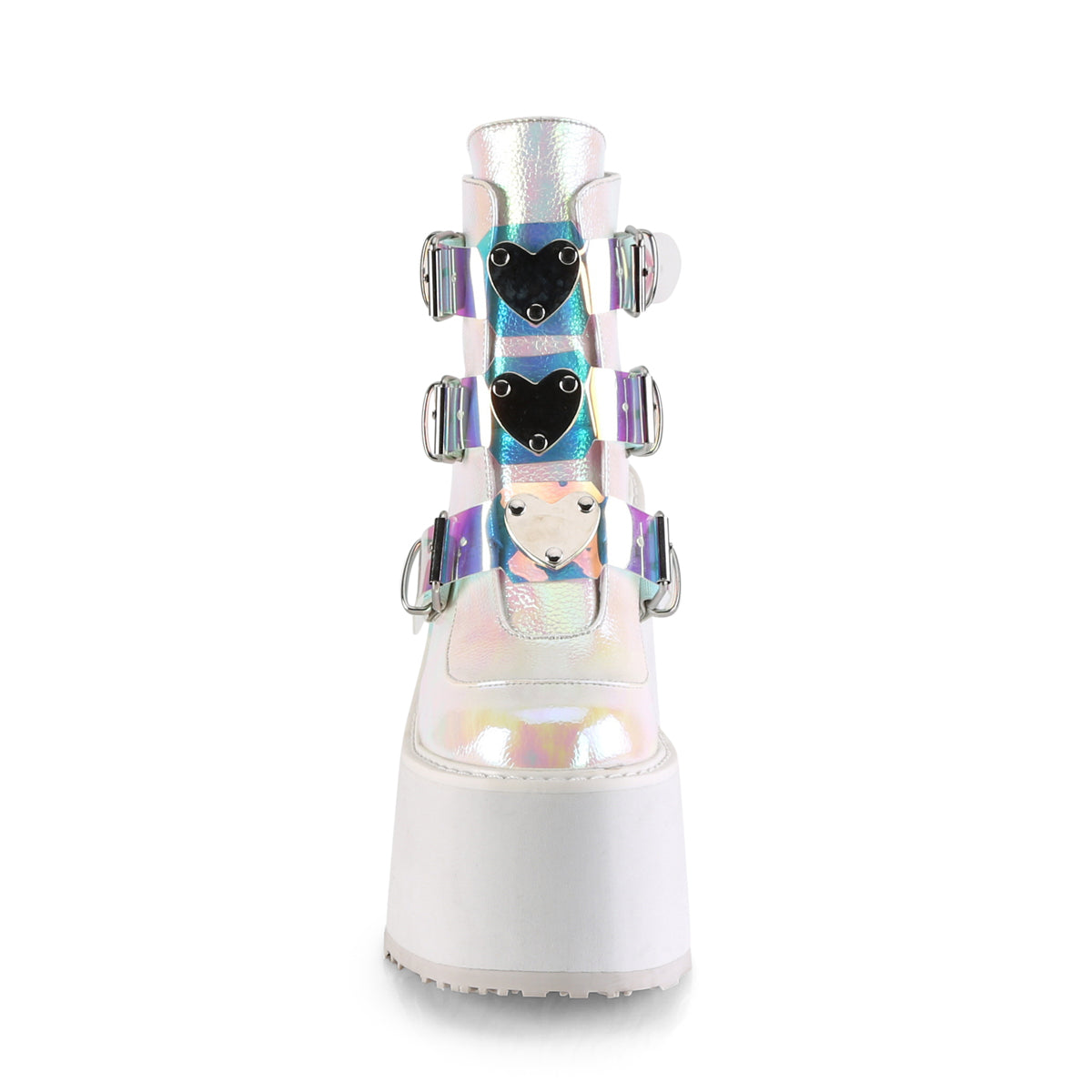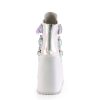 Introducing the Swing-105 ankle boot, where edgy design meets otherworldly materials. This boot stands out with its pearl iridescent vegan leather, capturing attention with a luminescent sheen. Anchored by a 5 1/2″ wedge platform, it offers an imposing silhouette further accented by three buckle straps with metal plates that add a touch of rebel chic. The back metal zip closure allows for easy entry, making these boots not just a statement piece but a staple for the avant-garde wardrobe.