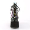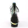 Craft a statement ensemble around the Swing-115 ankle boot, your portal to alt-fashion excellence. This piece marries a 5 1/2″ wedge platform with a confident lace-up front, all encased in a dynamic trio of black vegan leather, patent, and magic mirror faux leather. With its removable PVC harness and eye-catching hanging bondage strap, this boot invites a curated look. A metal inside zip closure completes the silhouette, reflecting a penchant for detailed craftsmanship and a dedication to bold, alternative aesthetics.