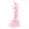 Elevate your edgy style with the Swing-815 knee-high boots, a futuristic take on rebellious footwear. These boots boast an impressive 5 1/2″ platform and are brought to life in baby pink hologram material that catches the light and eyes in every room. The design features eight buckle straps, each centered with a bold metal plate, adding a touch of industrial chic. The back metal zip closure provides a seamless finish to these standout boots, designed for those who dare to dominate the fashion scene.