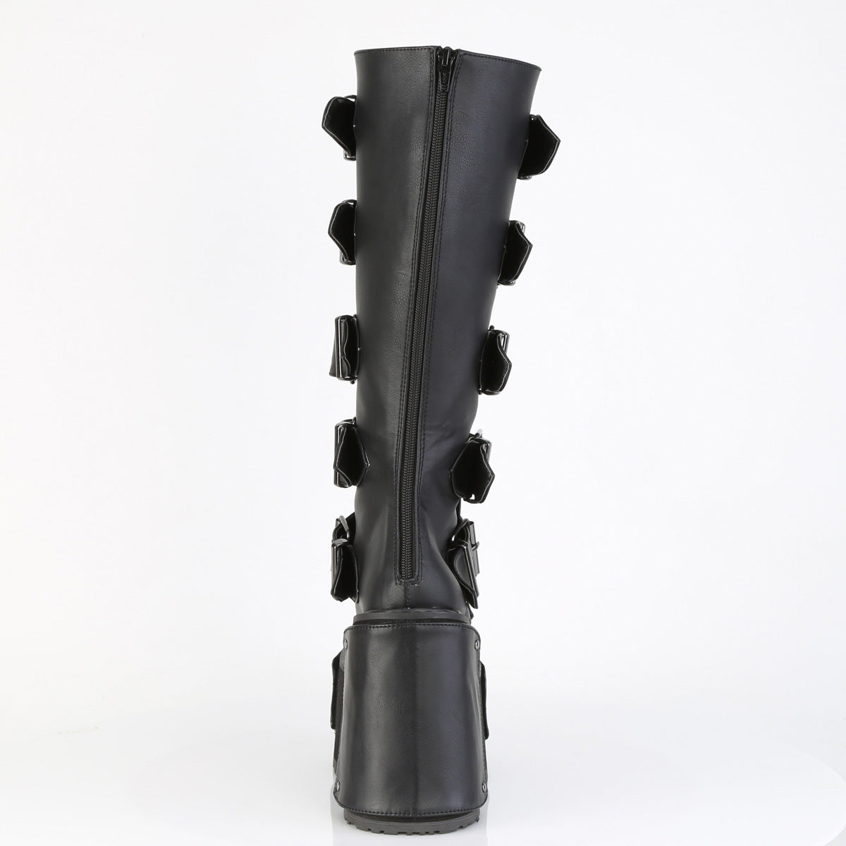 Meet the Transformer-800, a knee-high boot that lets you switch up your look in seconds. With a bold 5.5″ wedge platform and lace-up front, these boots come with four interchangeable front panels—choose from plane, flame, rubber spiked, or embossed pyramid studded designs. The hook-and-loop system makes swapping effortless, so you can go from sleek to statement-making in no time. Made from black vegan leather, these boots are built for versatility without sacrificing style. Whether you’re dressing up or keeping it casual, the Transformer-800 adapts to your mood.