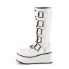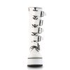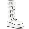 Introducing the Trashville-518, where edgy design meets ethical fashion. This knee-high boot boasts a robust 3 1/4″ platform, set in pristine white vegan leather, offering a sleek, daring look for any outfit or occasion. The front lace-up ensures a snug fit, complemented by dynamic buckle straps for an added edge. Featuring a full inner metal zipper for quick access, these boots are as practical as they are stylish. Whether hitting the town or making an entrance at a special event, the Trashville-518 boots are your ticket to a bold fashion statement.