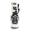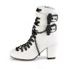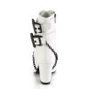 Elevate your footwear collection with the mesmerizing Vivika-128 boots. This ankle boot style captivates with its 3″ block heel and rounded toe, providing a sturdy and stylish base. The design is taken to the next level with a D-ring lace-up front, double coffin buckle straps, and an eye-catching O-ring plate, emitting a vibe of gothic romance. The dramatic allure is further intensified by double hanging chains looped through the heel channel and encircling the heel, all crafted from pristine white vegan leather, making these boots a symbol of alternative luxury.