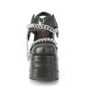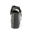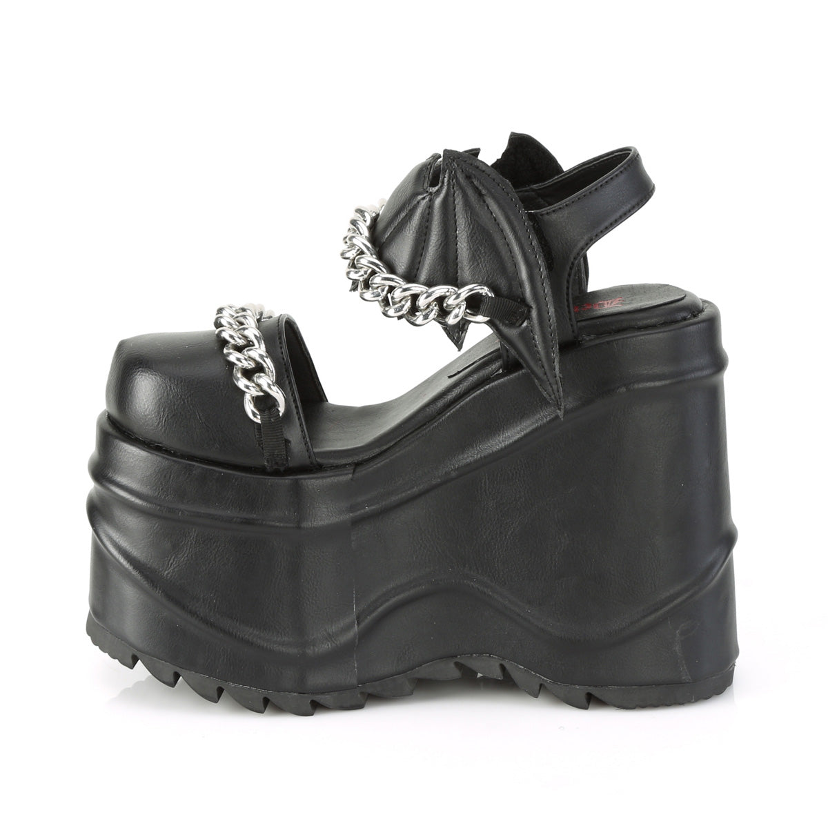 Elevate your wardrobe with the gothic charm of the Wave-20 sandals. These unique shoes feature a striking 6″ wedge platform and are fashioned from high-quality black vegan leather, offering both style and sustainability. The sandals’ design includes a close-toe silhouette and an ankle strap that closes with an intriguing bat-shaped hook and loop, complemented by moon and chain embellishments for an additional layer of allure. Perfect for those who dare to stand out, the Wave-20 sandals will add a touch of enigmatic flair to any ensemble.